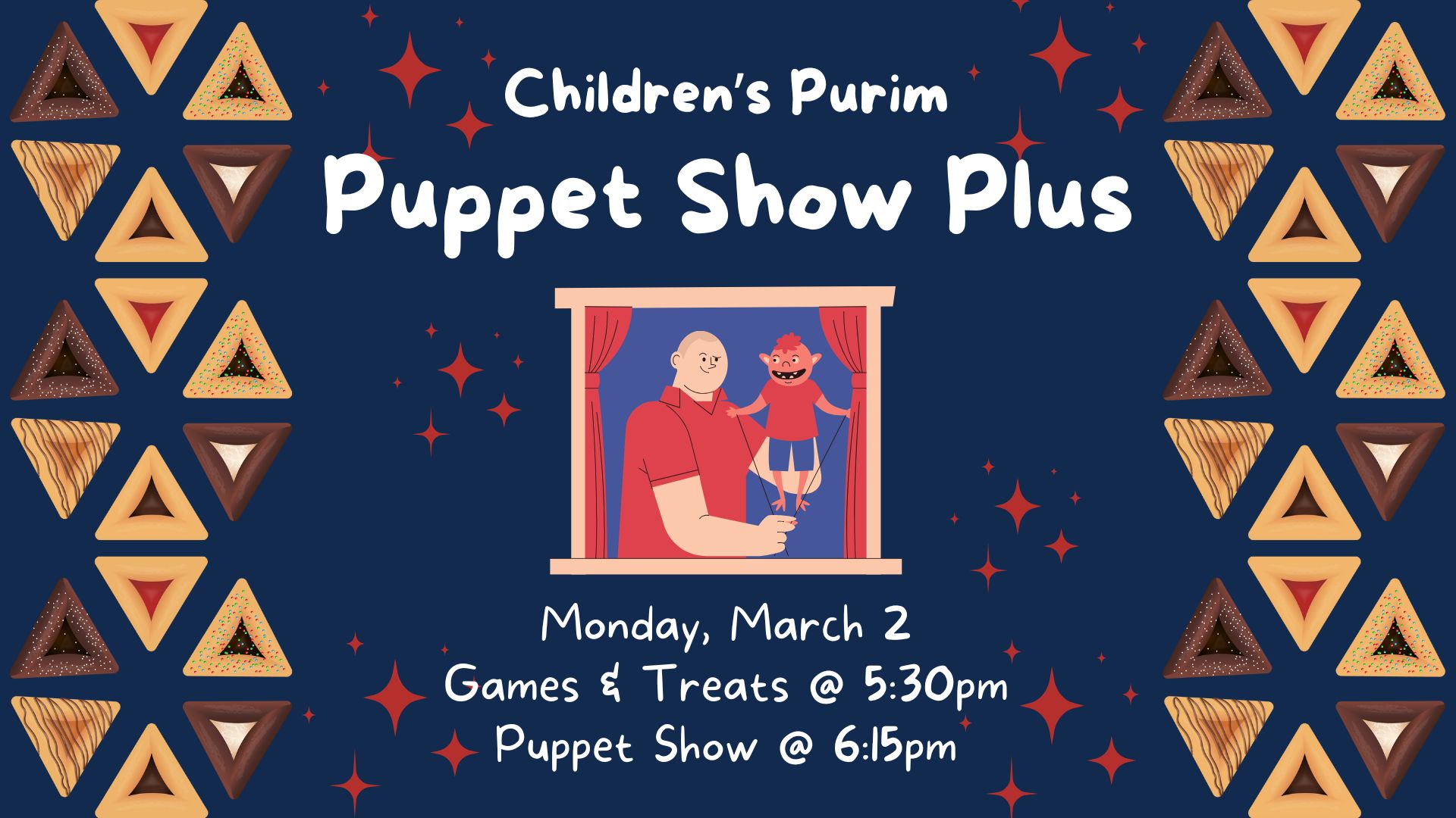 Come celebrate Purim with the third year of our Puppet Show “Plus”! Kids of all ages are welcome to join us for sweets, treats, games, and crafts at 5:30pm on Monday March 2, followed by live music and the annual Purim Puppet Show at 6:15pm. Services will take place at7:15 pm with Ma’ariv, megillah reading, and shpiel. Hope everyone can join us.