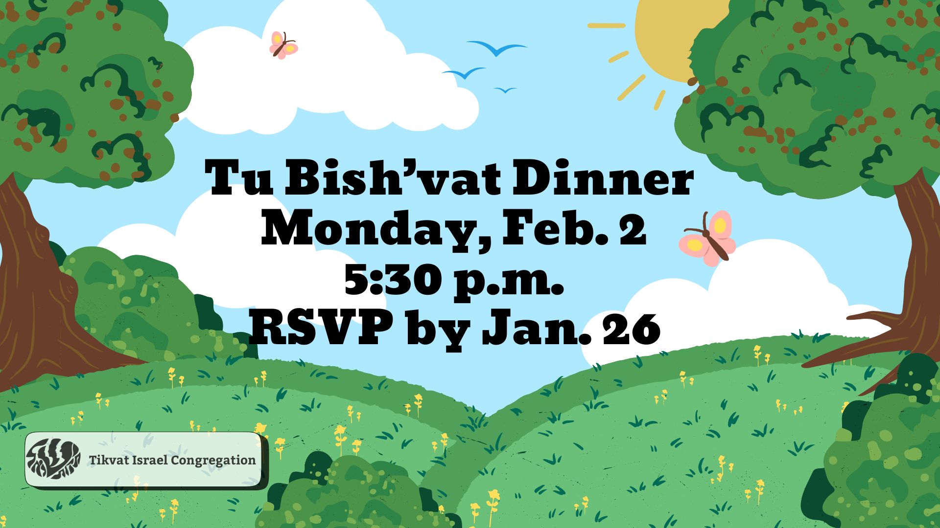 Join us Monday, February 2, at 5:30 pm, for a festive Israeli dinner in the social hall to celebrate Tu Bish’vat, the New Year of The Trees. Dinner is $39 per adult, $20 for kids ages 5-12 and free for 4 and under. Menu Tasty Falafel and Succulent Savory Shawarma With Pita Israeli Salad Israeli Couscous With Continue Reading »
