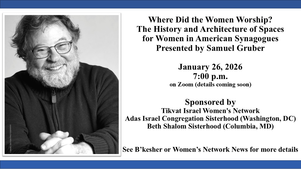 In this illustrated talk, art and architectural historian Dr. Samuel Gruber will present a fascinating overview of the role of women in Jewish worship space, focusing specifically on the types of physical spaces allowed to women in European and American synagogue architecture from the 18th century until today. Dr. Gruber will present historical material much of which comes from his own continuing investigation of synagogue buildings and other Jewish places throughout the world.