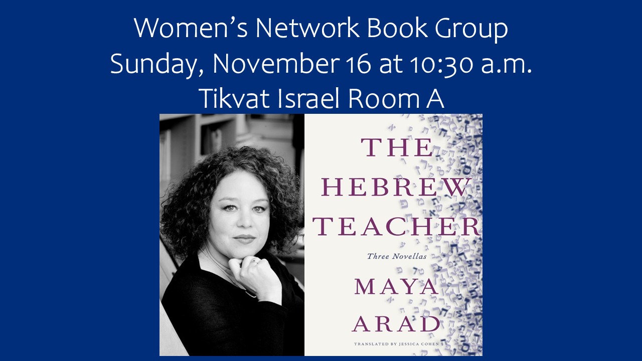 Join us in-person Sunday, November 16 at 10:30 a.m. Tikvat Israel Room A for a discussion of Maya Arad’s “The Hebrew Teacher.” Recently translated into English, this book examines the experience of three Israeli women whose lives were altered by immigration to the United States. Three novellas full of wisdom, generosity, humor and sharp insights into expatriate life.